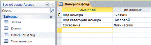Необходимо создать таблицы: Клиент, Номерной фонд, Типы номеров, Заказы.