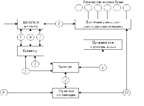 участвуют посредник (ипотечное агентство) и/или участник финансового рынка