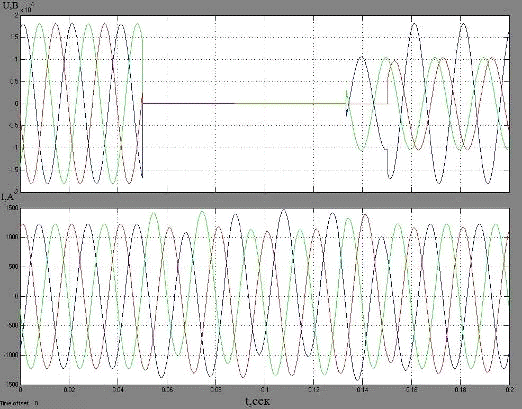 Рисунок 3 - осциллограммы тока и напряжения при КЗ в точке К1