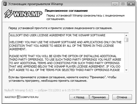 соглашение проигрывателя winamp. Если вы согласны с условием соглашения, то