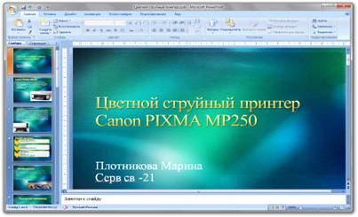 По умолчанию слева расположена панель слайдов, позволяющая просматривать