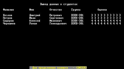 появится список с информацией о студентах: фамилия, имя, отчество, группа, 10