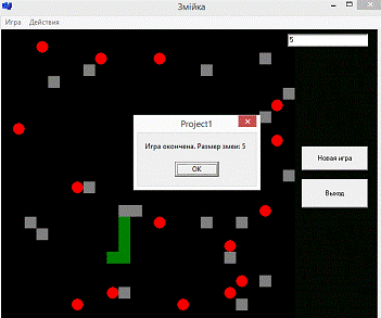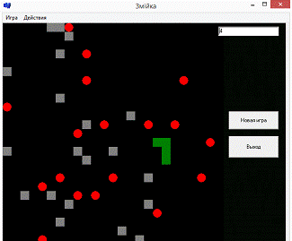 змійка рухається по ігровому полю оминаючи перепони і їй потрібно влучити в