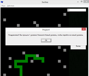 рівня, програма виводить повідомлення про виграш. Кількість яблук, які потрібно