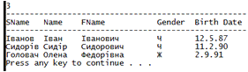 <<'\t'<<(P.GetGender()?'Ж':'Ч')<<'\t'