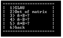 Выводится меню из 3 пунктов: печать СЛАУ с погрешностью вычислений в