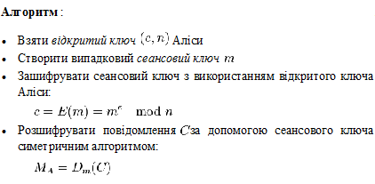 продуктивних симетричних алгоритмів з випадковим ключем (сеансовий ключ), а за