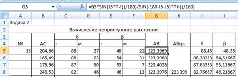 неприступного расстояния в МS Excel: АВ=223,399 м.