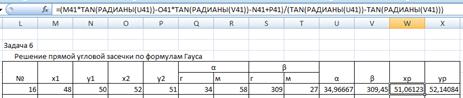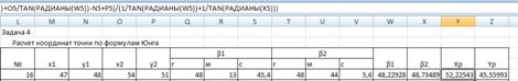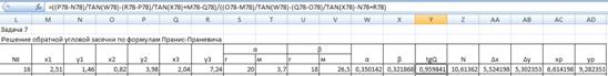 Рис. 12. Рабочее окно MS Excel при расчете прямой угловой засечки