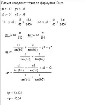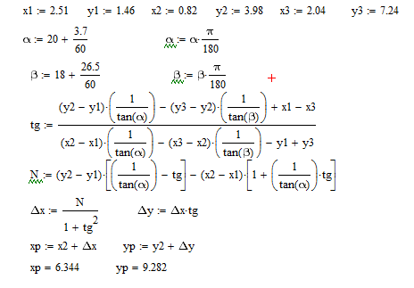 Рис. 12. Рабочее окно MathCad при расчете прямой угловой засечки