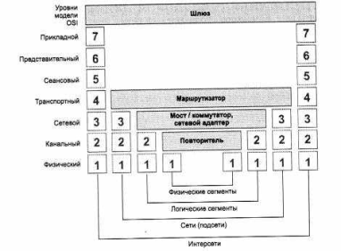 соответствие функций различных коммуникационных устройств уровням модели OSI.