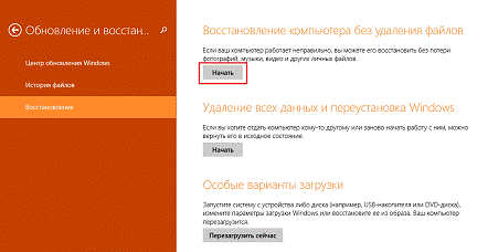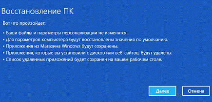 файлов", сохранятся файлы и личные настройки, настройки ПК возвращаются на