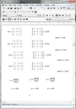 Рисунок 7. Окончательный вид рабочей области MathCAD решения системы уравнений методом Крамера