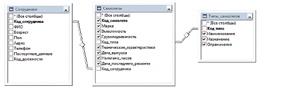 Сотрудники, Самолеты Типы самолетов. Запрос представлен на рисунке 2.2.2