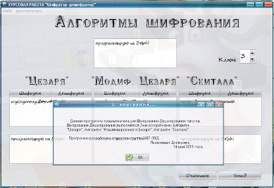 использовал три метода шифрования: алгоритм «Цезаря», алгоритм