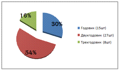 двухгодовики (54%) среди них: самок 14 (28%), самцов 13 (26%);