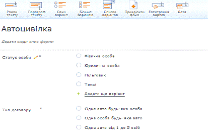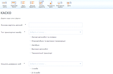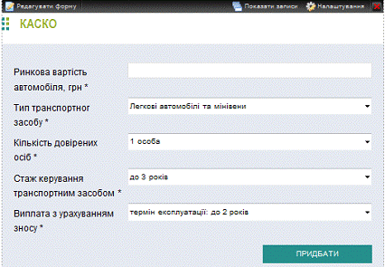 розмістила форми для придбання певного полісу: КАСКО, Автоцивілка та Для