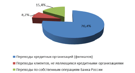 Доля переводов по собственным операциям Банка России в 2012 году составила 0,1% от общего количества и 15,4% от общего объема осуществленных через платежную систему Банка России переводов денежных средств.