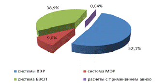 Удельный вес переводов денежных средств через системы расчетов с применением авизо составляет менее 0,1% как по количеству, так и по объему.