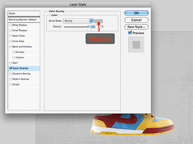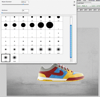 черную, мягкую кисть Brush Tool (B), чтобы стереть заднюю часть обуви без