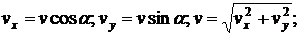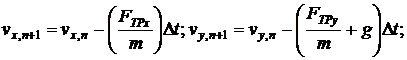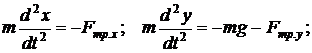 по времени;- коэффициент сопротивления воздуха;- угол вылета;, vy - проекции