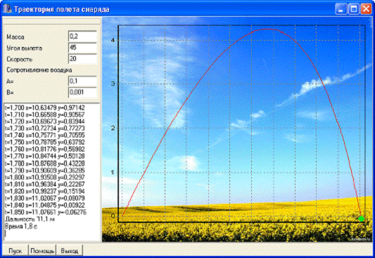 Пользователю необходимо задать исходные данные - массу снаряда, угол