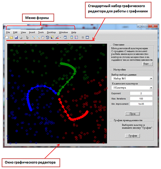 Exponent, Max. Iterations, Min. Improvement - поля ввода данных пользователя, заполненные значениями по умолчанию.