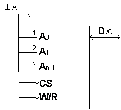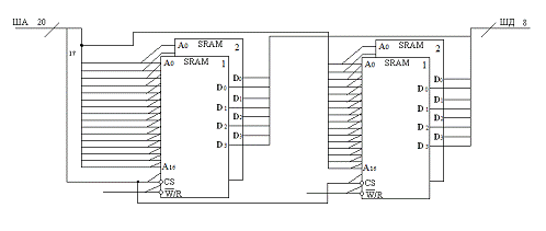 выход данных и вход CS (выборки кристалла). Схема ОЗУ имеет 17 адресных входов