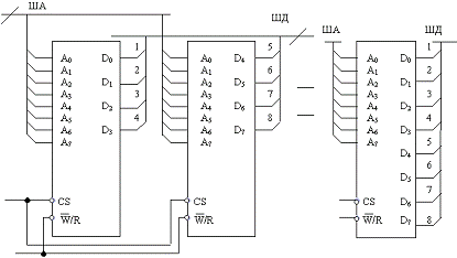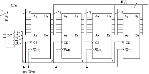 Для построения памяти на 1 Кбайт необходимо 4 таких схемы: