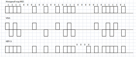 последовательность из кода NRZ в линейные коды: ЧПИ, КВП-3, 4В3Т, 2B1Q, 5В6В,