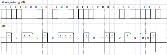 последовательности из кода NRZ в линейный код 4В3Т показано на Рисунок 2.