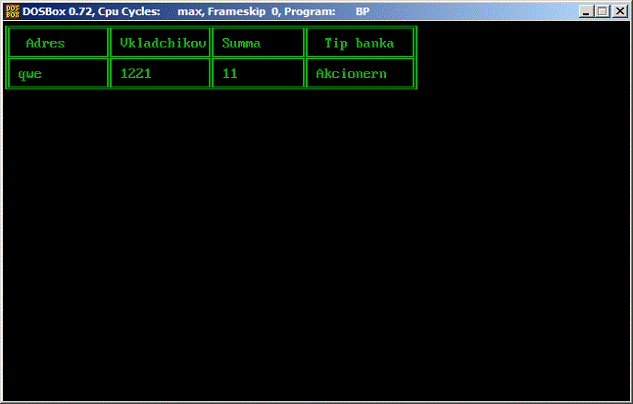 Adres ║ Vkladchikov║ Summa ║ Tip banka ║');('╠════════════╬════════════╬═══════════╬═════════════╣');('║