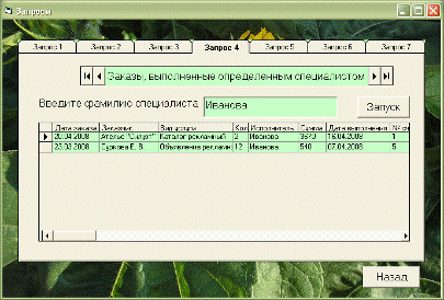 заказов, выполненных определенным специалистом, имеем следующий программный