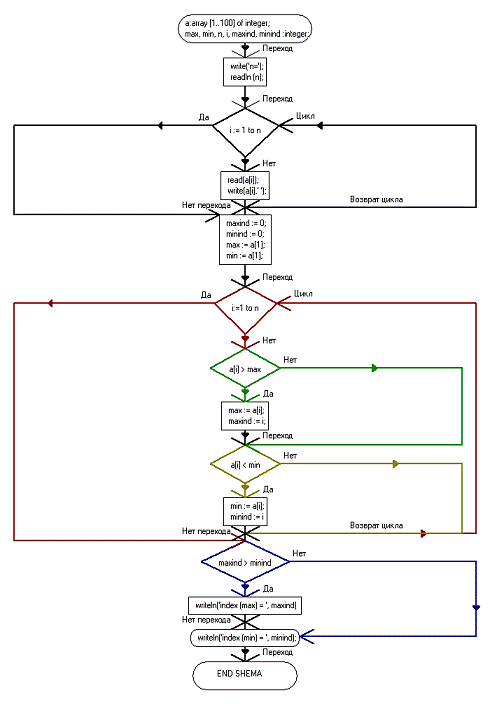 I;;a[i] < min then begin:= a[i];:= I;;; maxInd > minInd then //индекс