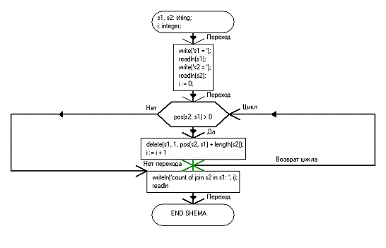 integer;('s1 = ');(s1);('s2 = ');(s2);:= 0;pos(s2, s1) > 0 do(s1, 1, pos(s2,