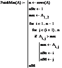 осуществляющая поиск номера строки матрицы, содержащей максимальный элемент