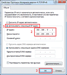 поле IP-адрес вводим адрес и маску подсети (например, такие IP - 192.168.0.1 и