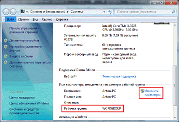 В открывшемся окошке можно задать имя и рабочую группу компьютера.