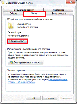 окне свойств, переходим на вкладку "Доступ" и нажимаем "Общий