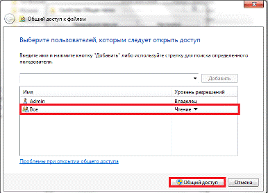 В поле “Добавить” выбираем "Все", в столбце Уровень разрешений