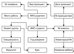 базы данных: база студентов, групп, происшествии, комнат, мебелей, факультетов.
