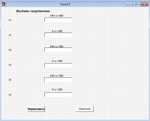 В окне Object Inspector удалим значения свойств Caption, для ввода нужных нам значений. Для компонентов Label1, Label2, Label3, Label4, Label5, Label6 изменим значения свойств на x1,y1,x2,y2, х3, у3. Кнопки Button1 и Button2 переименуем как "Нарисовать" и "Очистить"