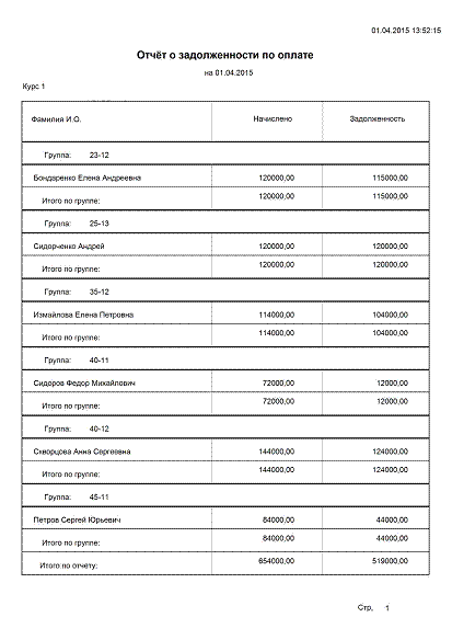 позволяет получить отчет о задолженностях на определенную дату заданного курса.