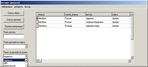 является моя база данных «каталог запчастей автомобиля». Она позволяет