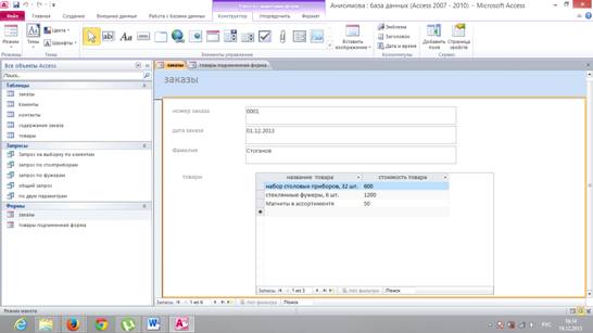 содержания заказа создаст подчиненную форму по таблице товары.
