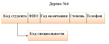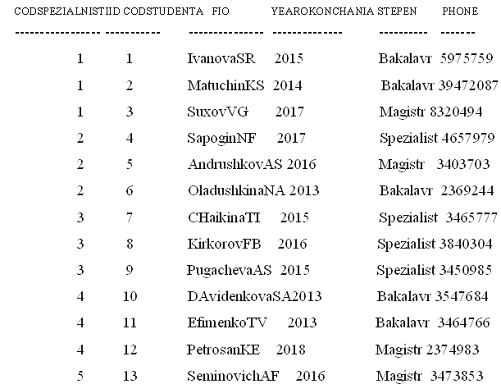 специальности, Код студента, ФИО, Год окончания, Степень, Телефон)