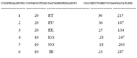специальности, Код факультета, Название специальности, Кол-во мест, Кол-во