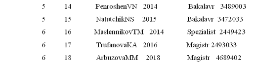 (час/нед), Тема научной работы, Довузовское обучение (1/0), Телефон, Кол-во