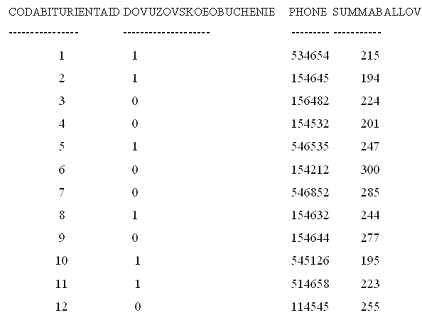 (Довузовское обучение (1/0), Телефон, Кол-во баллов (∑))