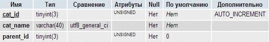 выбрать поля cat_id, cat_name, parent_id из